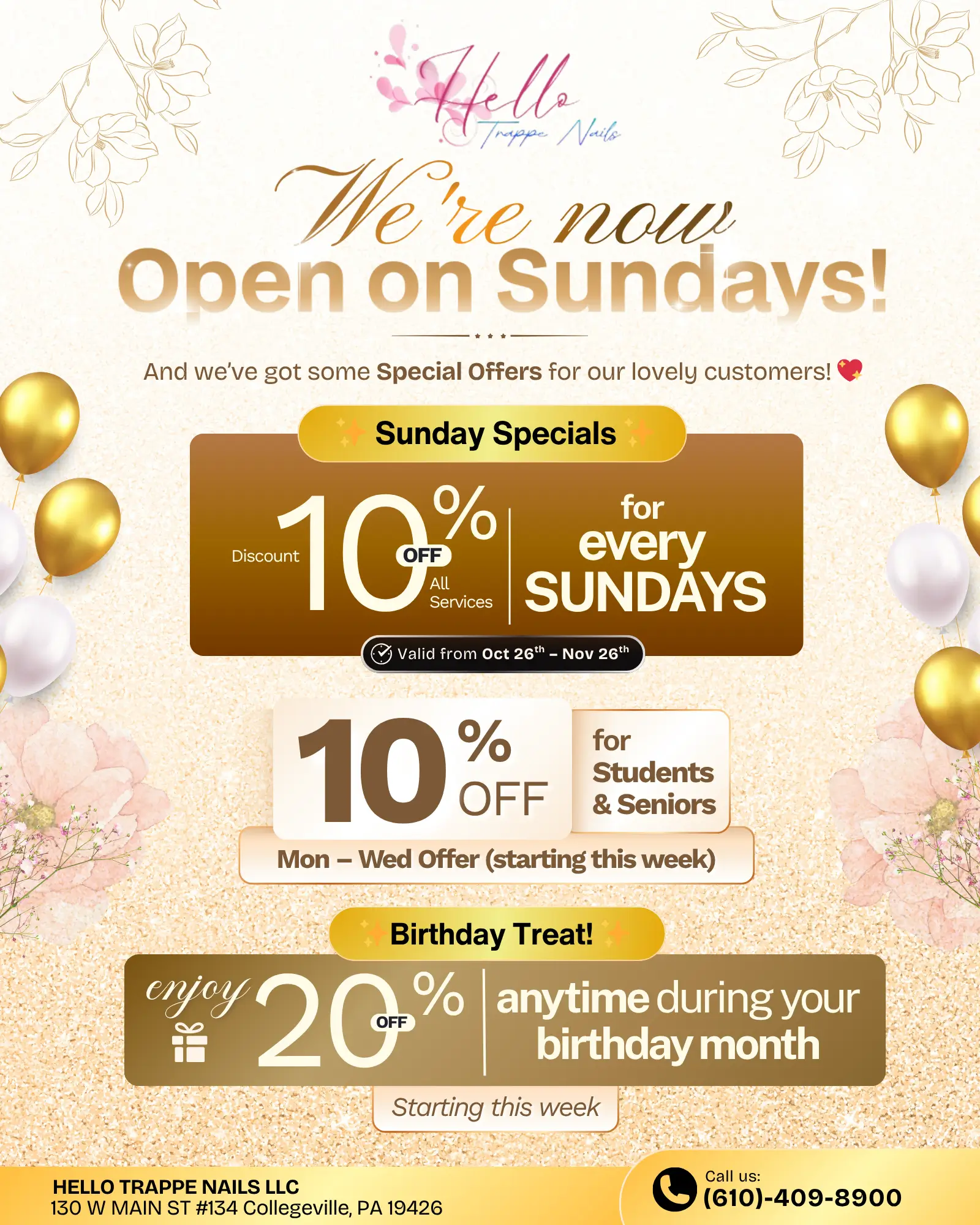 Visit Hello Trappe Nails LLC at 130 W Main Street, Ste 134, Trappe, PA 19426 to experience 5-star nail service at a reasonable price!